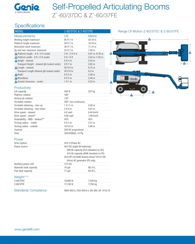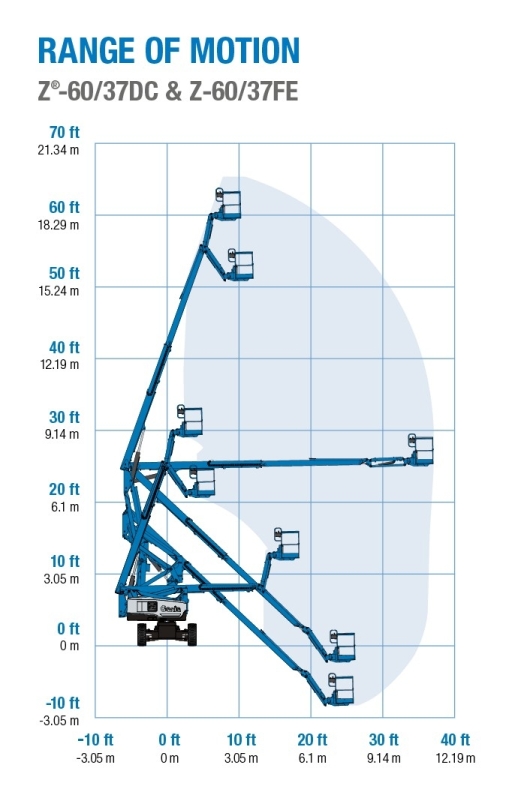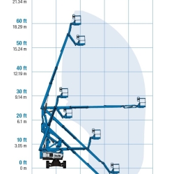 Hij is breed inzetbaar tot een werkhoogte van 16 meter en met een werklast van 227 kg. De reikwijdte gaat (vanaf het hart van de machine) 11.05 meter. Het is stabiele en veilige machine voor het werken op lastig bereikbare hoogtes.