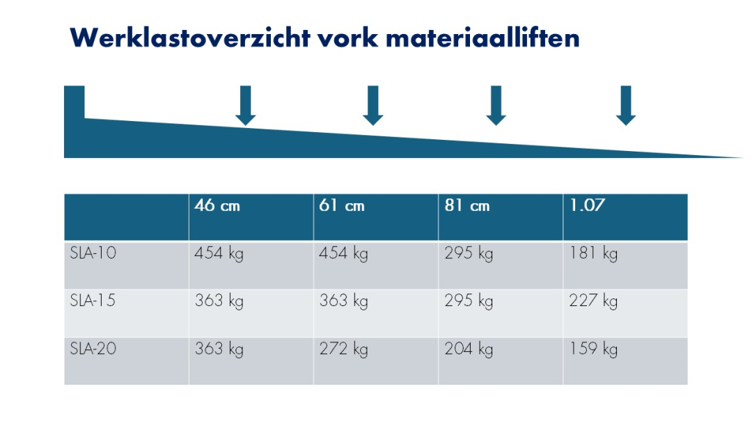 Kijk voor de werklast van deze materiaallift op de vork in het specificatieschema bij de afbeeldingen.