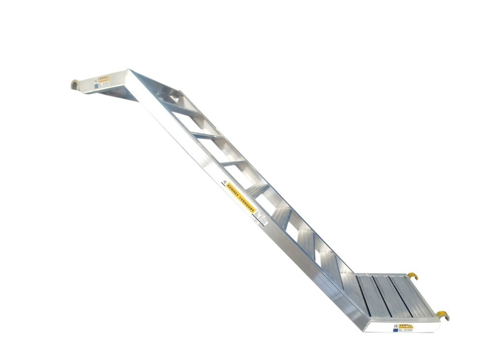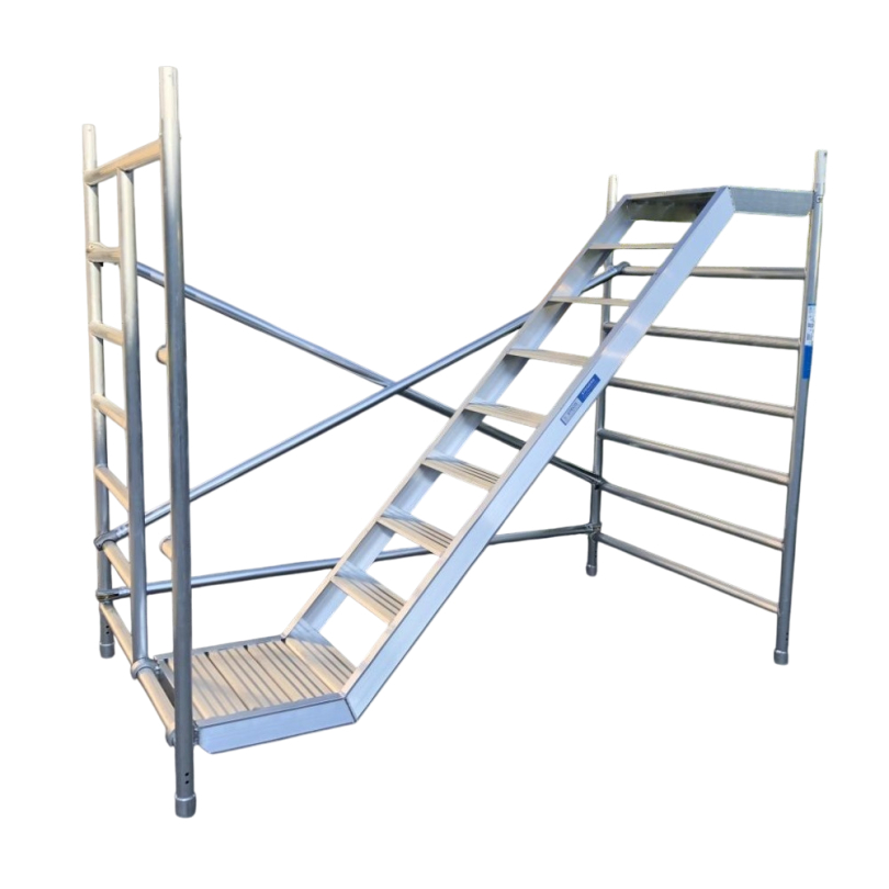 Deze professionele rolsteigertrap, ook wel steigertrap of laddertrap genoemd, kan gekoppeld worden aan een rolsteiger, waardoor er een trapconstructie op de rolsteiger onstaat.
