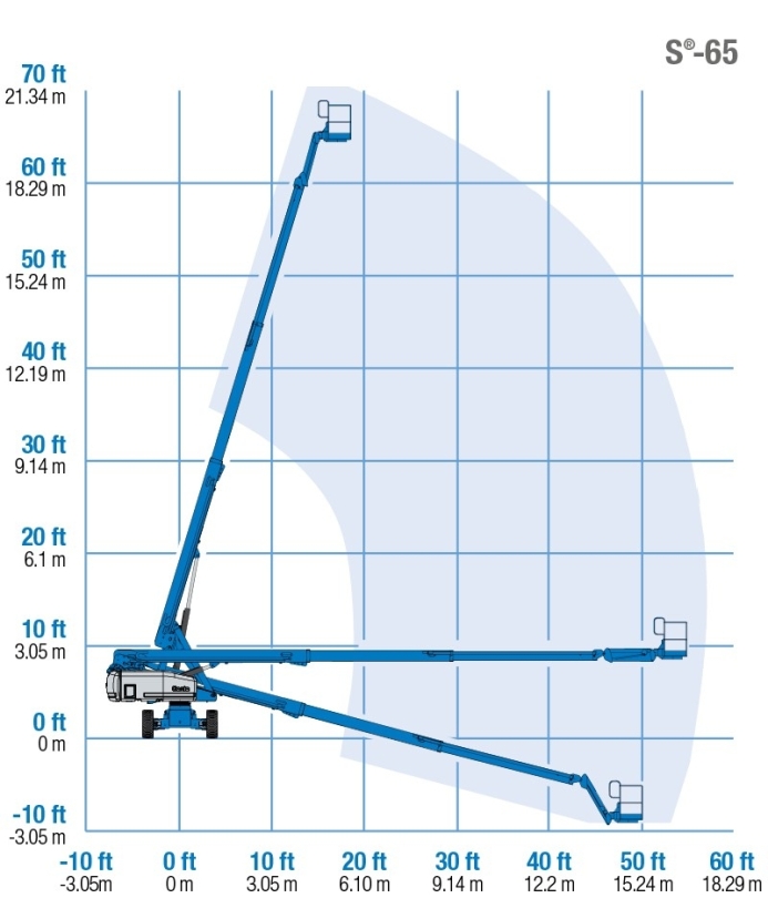 De reguliere S-65 kan met een reikwijdte van 17,10 meter kun je een grote horizontale afstand overbruggen. Met een platform van 1.80 m x 0.91 m (lxb) en werklast van 227 kilogram kunt u op hoogte diverse werkzaamheden uitvoeren. De Genie S-65 telescoophoogwerker wordt vaak gebruikt bij de bouw van bijvoorbeeld een appartementencomplex of bedrijfspand.