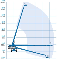 Dankzij de vierwielaandrijving is de Genie S-65 geschikt op ruwe ondergronden zoals modder en/of zand. Wij hebben 2 type S-65 hoogwerkers in huis. Beide hoogwerkers hebben een werkhoogte van 21.80 meter.