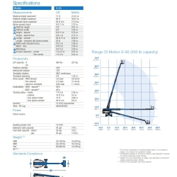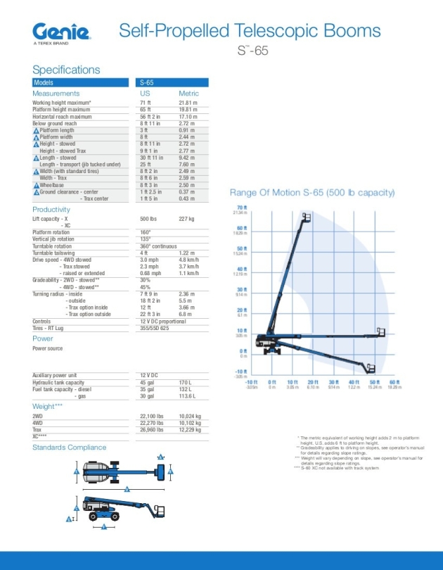 De S-65-XC heeft een platform van 2.44 m x 0.91 m (lxb) en reikwijdte van 15.24 meter. De werklast van S-65-XC is 454 kilogram. Hierdoor kan de XC variant zwaarder heffen dan de reguliere S-65.