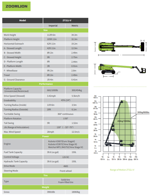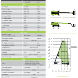 Deze diesel aangedreven telescoophoogwerker is breed inzetbaar tot een werkhoogte van 34.30 meter en met een belastingcapaciteit van 454 kg. De horizontale reikwijdte gaat tot 19.20 meter.