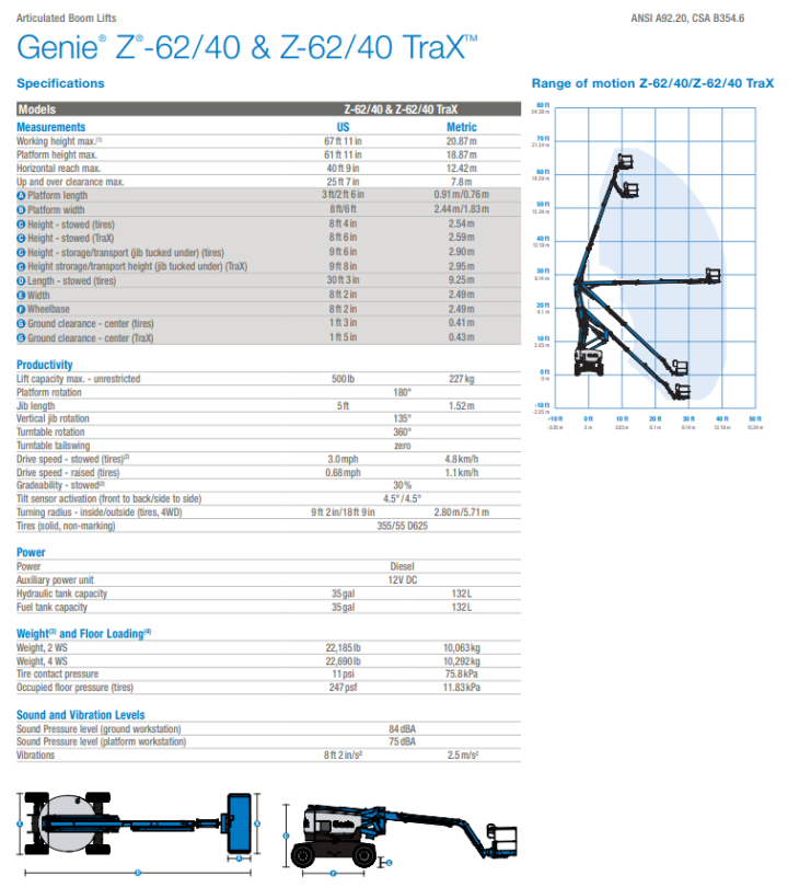 Deze knikarmhoogwerker heef teen werkhoogte van 21 meter en een reikwijdte van 12,4 meter (vanuit het hart van de machine).